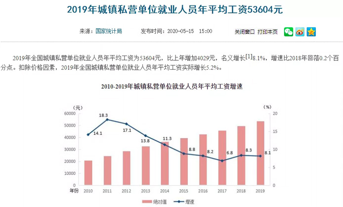 據統計局數據:2019年全國城鎮非私營單位就業人員年平均工資為90501元,比上年增長9.8%,扣除價格因素,實際增長6.8%;城鎮私營單位就業人員年平均工資為53604元,比上年增長8.1%,扣除價格因素,實際增長5.2%。